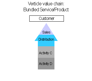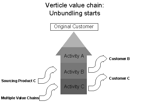 Shown in Figure 5 is the unbundeling of the B and C value chain activities: These can now both be sourced from outside and sold to customers intermediate from the original final customer. For example, in the computer industry, the operating system may be sourced externally and be made available to other competitors. Grove (p47) discusses the example how IBM struggled with exactly this, in its marketing of OS/2. At first they tried to keep it proprietary, and later, when they tried to gain more acceptance for it, the market did not trust IBM because the operating system was not sufficiently independent of the other IBM activities against which the OS/2 customers still had to compete.