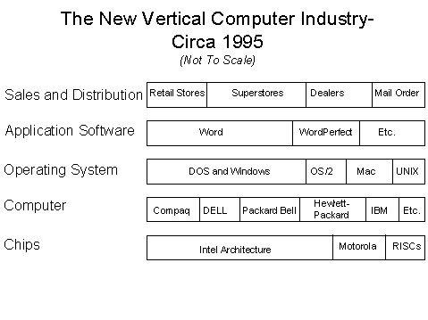 Quoting from Grove(p43): In this diagram we have horizontal bars representing fields of both competence and competition. In chips suppliers of microprocessors using the Intel microprocessor architecture compete with companies such as Motorola and others who supply different types of microprocessors. In computers, a basic computer design is supplied by a variety of computer manufacturers, such as Compaq, IBM, Packard Bell, Dell and many others. These computers are fundamentally similar even if the computer company engineers improve the basic machine as they compete with each other.” (Emphasis added.) He goes on to show that the same competition exists for operating systems, application software and sales avenues. In each case there is a ‘field of competence’ around which a number of players compete for dominance. The overall picture is one of far greater choice for the customer of each field, but also of far greater complexity and competition in the current computer industry.