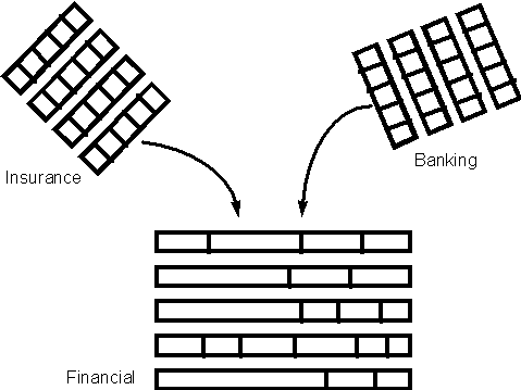 The picture is however more complex that that above. From what I have seen in the banking industry, I believe what is happening is a similar unbundeling of services and products, outsourcing of functions and a widening in the scope of customers types targeted. I am unsure which of the insurance or banking industries have toppled the most from the vertical, but I would depict the banking industry somewhat like that in Figure 10.