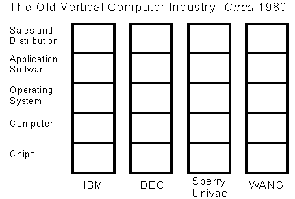 What happened, according to Grove, in the computer industry was that the price/performance advantage swung into the favour of personal computers. This resulted in a total re-organisation of the computer industry into what he refers to as a horizontally, as opposed to the old vertically, organised industry. This is depicted in Figure 4.