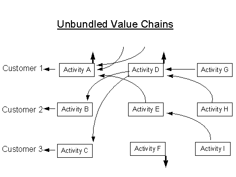 Shown in Figure 5 is the unbundeling of the B and C value chain activities: These can now both be sourced from outside and sold to customers intermediate from the original final customer. For example, in the computer industry, the operating system may be sourced externally and be made available to other competitors. Grove (p47) discusses the example how IBM struggled with exactly this, in its marketing of OS/2. At first they tried to keep it proprietary, and later, when they tried to gain more acceptance for it, the market did not trust IBM because the operating system was not sufficiently independent of the other IBM activities against which the OS/2 customers still had to compete.